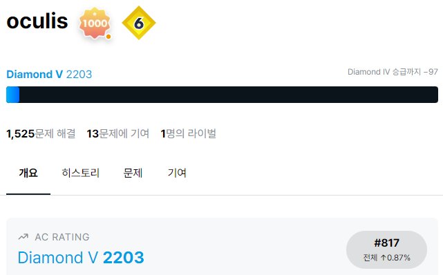 다이아를 찍었다. 2021년 7월 13일에 15964 문제를 풀면서 시작한 백준이 어느덧 다이아까지 왔다. 1년 반 정도 걸렸다. 문제 당 제출 수가 상당히 많은데, DP나 그리디가 뭔지도 모를 때나 자료구조에 대한 개념이 하나도 없을 때 침착하게 배울 생각은 안하고 무작정 달려들어 얻어 터지느라 그랬다.