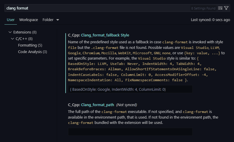 Ctrl + , 을 이용해 설정으로 접근하고 아래로 내려서 Clang_format_style을 찾아준다.